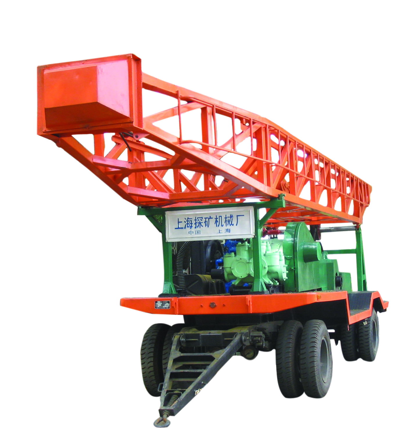 > 钻机底盘为拖车型式,方便用普通的牵引车来牵引。